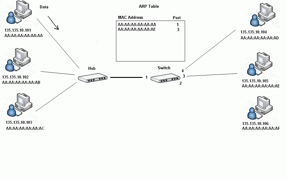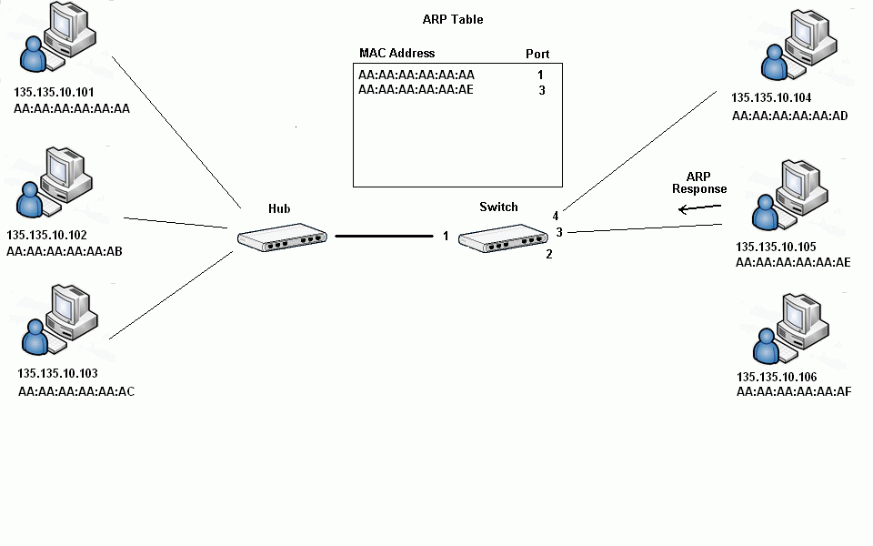 When Host 105 receives the ARP request, it sends an ARP Response which basically says, "Here's my IP address and my MAC Address." The switch will receive the packet destined for Host 105 and first recognize the MAC address of host 105. It will add the MAC address and port of Host 105 to its ARP table. Then, it will lookup the MAC addresses it has in its ARP table and see that Host 101's MAC address is there and only forward the packet to that port (in our case, port 1).